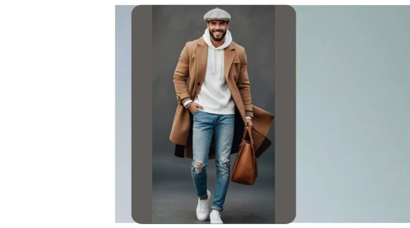 And don’t even get us started on the rest of the outfit! He’s rocking some cool ripped jeans – because who says holes can’t be fashionable even when it’s chilly? Paired with fresh white sneakers, a classic flat cap, and even a stylish brown bag, he’s got all the details on point. It’s the perfect blend of casual comfort and suave sophistication, making him look ready for anything from grabbing a pumpkin spice latte to charming squirrels in the park.