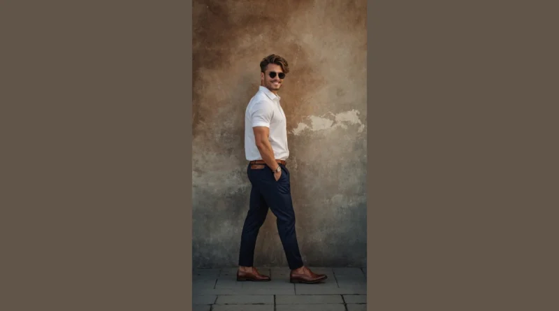 Check out this guy! He’s got that ‘I just woke up looking this cool’ vibe, but let’s be honest, his hair probably took more strategic planning than my entire week. With that crisp white shirt and sharp navy pants, he’s basically serving up a masterclass in looking effortlessly put-together. You can tell he matched his snazzy brown belt to his slick shoes, and those sunglasses? They’re not just for blocking the sun; they’re probably hiding the secret to his perfectly timed, over-the-shoulder smile.