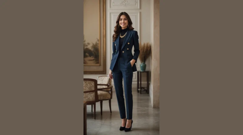 Check out this fashion superstar! She’s absolutely rocking that navy pantsuit, making business casual look less like “boring office wear” and more like “I’m about to conquer the world, but first, let me show off these snazzy gold buttons!” Her outfit, with the sleek turtleneck and bold gold necklace, proves that looking polished doesn’t mean you have to dress like a robot. It’s the perfect blend of serious style and a hint of sparkle, like she’s saying, “I mean business, but I also know how to have fun!”