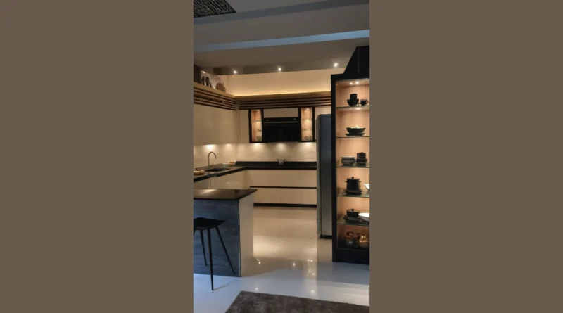 And check out those snazzy display shelves on the side, showing off all the cool dishes! It’s like a museum for your cookware, so perfectly lit that even your grandma’s chipped mug would look sophisticated in there. The contrast between the bright cabinets and the dark countertops is super sharp, making the whole place look like it’s ready for anything from a baking marathon to just chilling on that stylish island stool while you scroll through TikTok. This isn’t just a kitchen; it’s a sleek operation center where you can whip up snacks, conquer homework, or just enjoy feeling like you’re living in the future, one perfectly lit pot at a time.