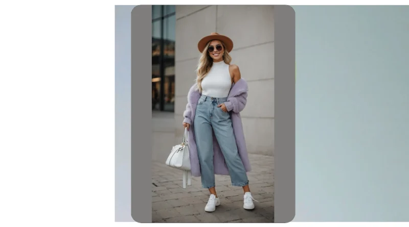 Talk about a cozy fashion statement! This whole look just radiates good vibes, from the amazing smile to that super fluffy lilac coat that probably feels like a giant, stylish hug. We’re loving how comfy and chic those light-wash, wide-leg jeans look – you know, the kind you can actually move and breathe in, not those super tight ones that make you regret lunch. Throw on a cool hat and some sunnies, and you’ve got an outfit that’s ready for anything, whether it’s a quick mall trip or just feeling fabulous while walking down the street.